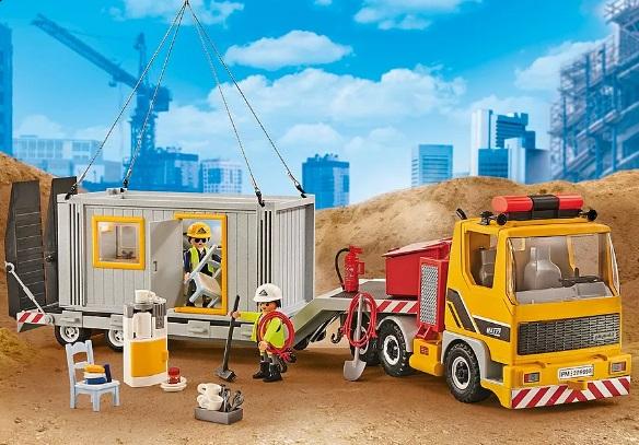 Dimensiones: 44.3 x 24.5 x 19 cm. El set contiene una figura de PLAYMOBIL, un camión de plataforma con contenedor, un pequeño contenedor, un extintor de incendios, un casco, una escoba y muchos otros extras. La cabina del conductor ofrece espacio para dos figuras y puede ser plegada hacia adelante. Dentro del contenedor hay una mesa con dos sillas y una cama empotrada, así como un pequeño baño completo con lavabo e inodoro. El contenedor móvil sirve a los trabajadores de la construcción como oficina y sala de descanso.