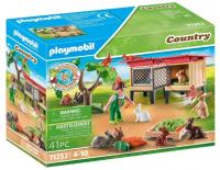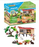 Dimensiones: 6 x 6 x 7 cm. Incluye figura de cuidadora. Dos establos ofrecen un refugio para los numerosos conejos de variados colores. Los conejos son alimentados con forraje verde y zanahorias.