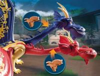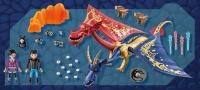 Dimensiones: 34.8 x 38.5 x 9.4 cm. Dragón de dos cabezas con cuello y cabezas móviles, patas y alas móviles, bocas abribles con función de disparo, 2 sillas para montar personajes adultos.