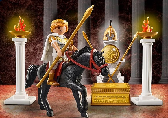 Dimensiones: 18.7 x 14.2 x 7.2 cm. Únete a Alejandro Magno, uno de los reyes más famosos de todos los tiempos, en su campaña contra los persas. Alejandro, hijo del rey Filipo II y de la reina Olimpia, nació en Pella a mediados del siglo IV a.C.. Tras el asesinato de su padre, Alejandro se convirtió en rey de Macedonia con sólo 20 años. Dos años más tarde, con una estrategia brillante, lanzó una increíble campaña militar contra los persas. Tras varias victorias y campañas ininterrumpidas que le llevaron hasta las profundidades de Asia, Alejandro cayó gravemente enfermo y murió en Babilonia a la edad de 32 años, en el 323 a.C. Embárcate en emocionantes aventuras de rol con el set de juego Alejandro Magno de PLAYMOBIL. El set de juguetes de 26 piezas incluye a Alejandro Magno, su caballo Bucéfalo, tres lanzas, dos columnas con cuencos de fuego, un casco y otros extras.