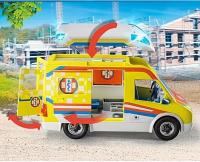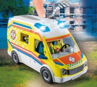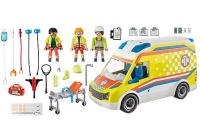Dimensiones: 38.5 x 28.4 x 12.5 cm. Incluye dos figuras de médicos y una de paciente. Moderna ambulancia, con puertas laterales y traseras que se abren, así como el módulo de luz y sonido en el techo. Requiere requiere tres micro pilas de 1,5 V (no incluidas). La camilla tiene medidas de seguridad, cuenta también con desfibrilador, suero y numerosos accesorios médicos para realizar misiones de rescate.