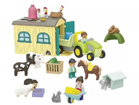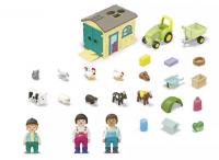 Dimensiones: 28.4 x 24.8 x 16 cm. Familia de granjeros formada por un hombre, una mujer y un niño. Tractor con enganche para remolque y remolque con portón trasero abatible. Carretilla y animales con sus respesctivos accesorios. Granero con placa clasificadora en el techo para clasificar por colores y formas, el niño tambien puede apilar y encajar estas fichas. Este set es perfectamente combinable con otros sets de animales y granjas.