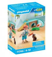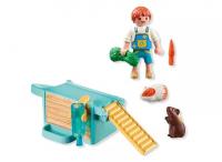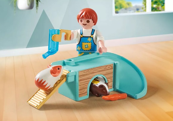 Dimensiones: 9.3 x 14.2 x 4.5 cm. En la Casa para cobayas de PLAYMOBIL, el niño cuida con ternura a sus dos cobayas. Entre escondites y una escalera, estos simpáticos roedores exploran su nuevo hogar con total libertad. La botella de agua les provee hidratación, mientras saborean zanahoria y hierba fresca.