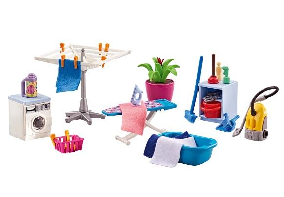 Dimensiones. 23 x 20 x 3 cm. Incluye lavadora, tendedero, tabla de planchar, aspiradora, cubo y otros extras. Este producto forma parte de la gama de PLAYMOBIL® PLUS. Estos artículos están pensados como accesorios y/o ampliaciones a los sets de PLAYMOBIL ya existentes. Este producto se entregarán en una bolsa de plástico en vez de en una caja de cartón.