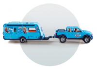 Dimensiones: 43.5 x 32.5 x 12 cm. Excursión de camping con la familia. Recoger con enganche para remolque, techo extraíble y portón trasero para abrir. Caravana con toldo, soportes traseros y techo desmontable. La caravana está equipada con una cuna para niños, una celda húmeda con puerta corredera, una esquina de cocina y un grupo de asientos, y ofrece mucho espacio para guardar accesorios. El grupo de asientos se puede convertir en el lugar para dormir de los padres.