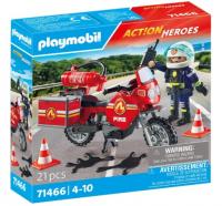 Dimensiones. 14.2 x 14.2 x 4.1 cm. El bombero atraviesa los atascos de tráfico en su ágil motocicleta, asegurando la escena del accidente. El manillar y el caballete móviles proporcionan un juego realista, mientras que la figura se asienta firmemente en la moto. El extintor y la caja portaequipajes pueden fijarse en el lateral, detrás del asiento, y transportarse cuando están desmontados. Los guantes desmontables, el casco con visera móvil y el protector permiten un detallado juego de rol.