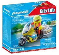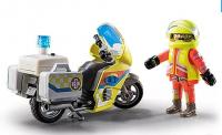 Dimensiones: 14.2 x 14.2 x 6.6 cm. Incluye figura de médico rescatista. La moto está equipada con una luz intermitente que se puede encender mediante un botón. Para distinguir al médico entre el tráfico de la carretera, el vehículo parpadea no sólo en la parte trasera de la maleta de la motocicleta, sino también alternativamente en ambos lados. Después de 60 segundos, la luz se apaga sola. Los accesorios médicos pueden guardarse y transportarse en el maletín médico con clip. Se incluyen vendas y bolsas de reanimación. También contiene: un casco, guantes, una máscara desmontables y, un maletín de médico con emocionantes extras.