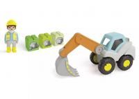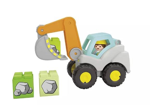 Dimensiones: 24.8 x 18.7 x 9.2 cm. El trabajador de la construcción y su excavadora están listos para un emocionante día en la obra. Con el brazo móvil de la pala se pueden transportar y apilar los bloques de construcción. Tres piedras apilables con impresiones. Excavadora con techo de cabina plegable y pala móvil flexible
