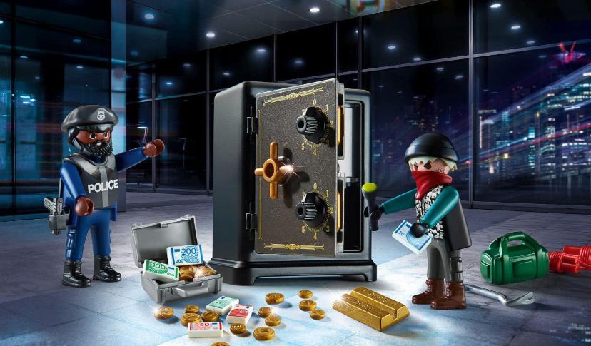 Dimensiones: 7 x 4,5 x 9,5 cm. Incluye figuras de policia y ladrón que logra abrir la caja fuerte.